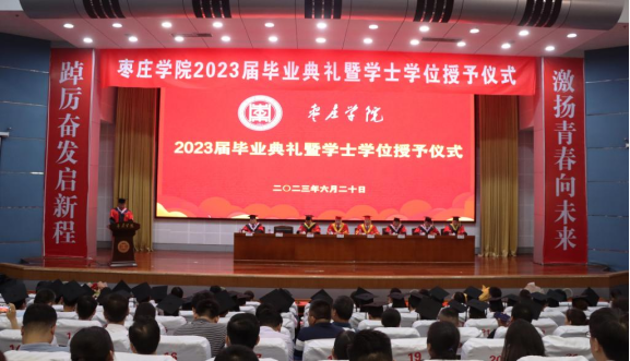 毕业典礼坚持以文化人、文化育人。印有“踔厉奋发启新程”“激扬青春向未来”字样的对联写真分列在会场两侧,鲜红的写真激励着毕业生们承时代使命、展奋斗风采。
