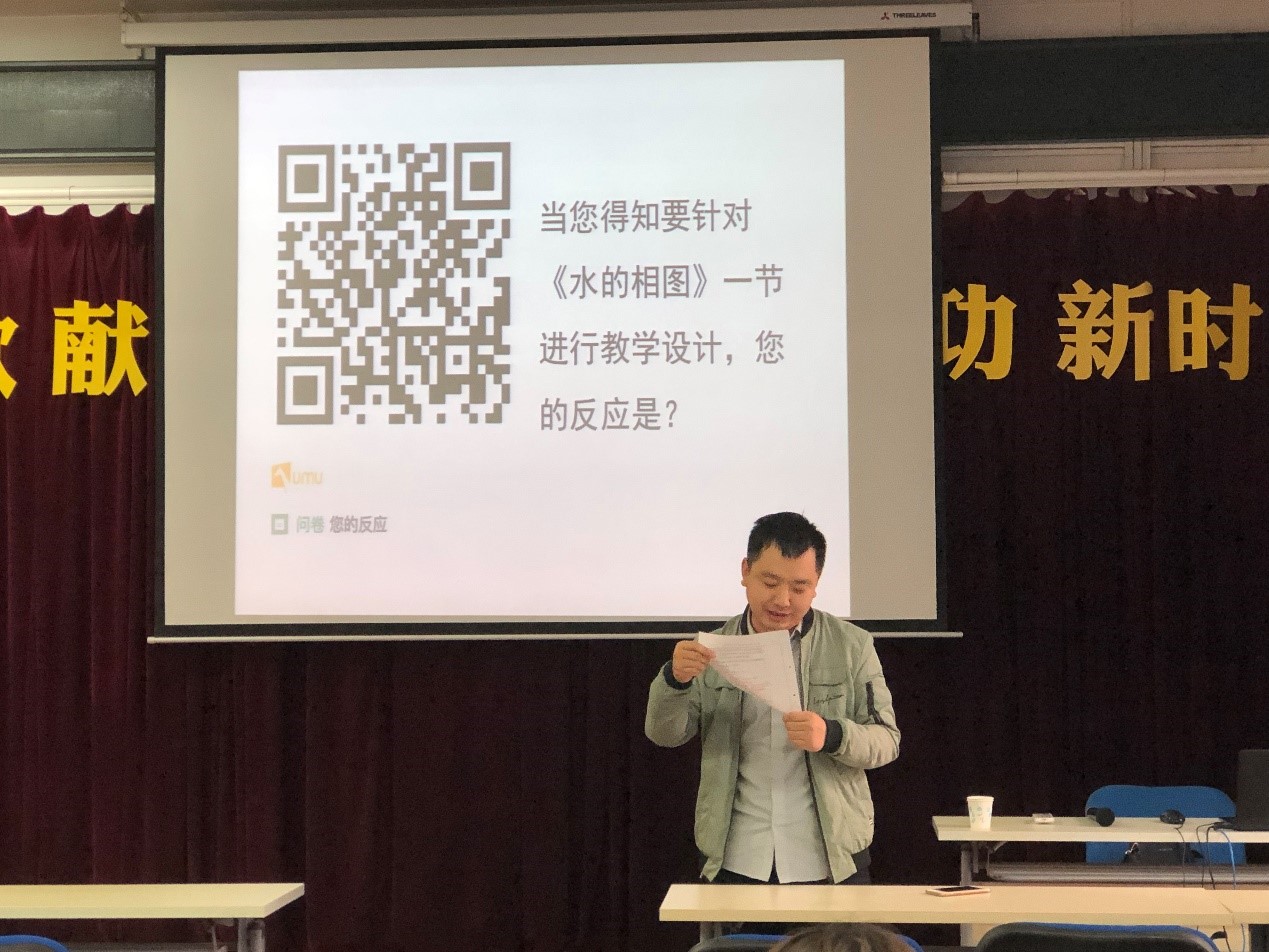 本次教学示范课由今年会何方老师主讲。何方老是为今年会优秀青年教师,在相关的教学技能大赛中多次拿奖,具有丰富的教学经验以及教学技巧。在本次示范课开始的前奏,何方老是通过调查问卷的形式了解各位老是对教学设计的认识,了解到每一位青年教师的具体情况。通过该调查问卷以及各个老师对《水的相图》所做的课程设计分享等,不仅给大家讲解了教学设计中的所包含的内容,也存在一定活跃课堂气氛的作用,同样使得各位教师明白在给学生授课时,学生对于陌生的概念的反应以及想法等。