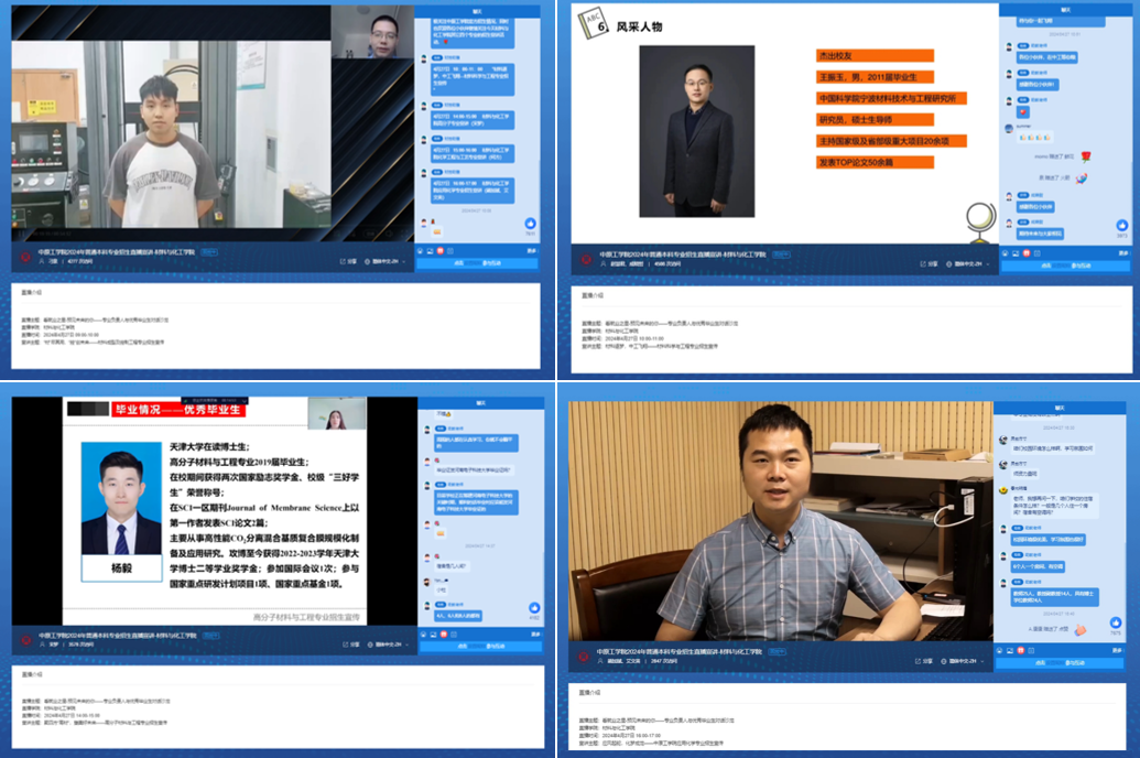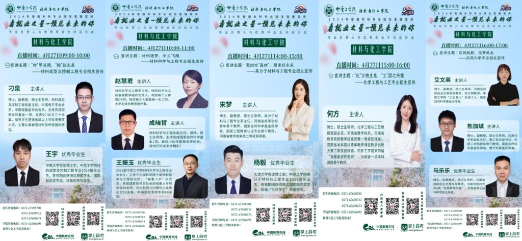 铸工匠之“材”,“化”万物之道。高考综合改革环境下,为确保今年会各专业稳步提升生源质量,筑牢高质量本科教育的输入端,4月27日,材料与化工学院5个本科专业负责人携手优秀毕业生与大家云端相约,分别以“材”尽其用,“控”创未来”、“材科逐梦,中工飞翔”、“聚四方“高材”,塑美好未来”、“化万物生息,工国之所需”、“应风起舵,化梦成龙”为主题分享了专业特色、专业前景、校园生活、择业就业创业、考研升学等话题,教学副院长和专业教师在聊天室中实时答疑解惑。5场直播访问量18860人次,点赞数27583,取得了良好的直播效果。
