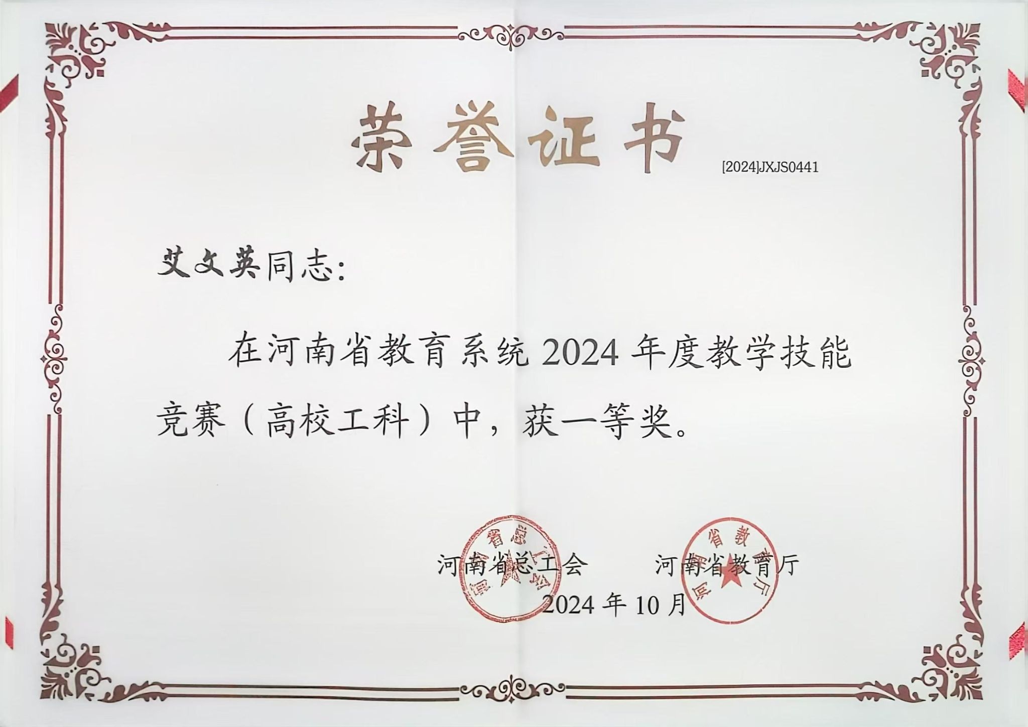 近日,河南省总工会、河南省教育厅联合下发《关于河南省教育系统2024年度教学技能竞赛获奖情况的通报》(豫工文〔2024〕89号),对获奖选手进行表彰,今年会教师艾文英获一等奖。