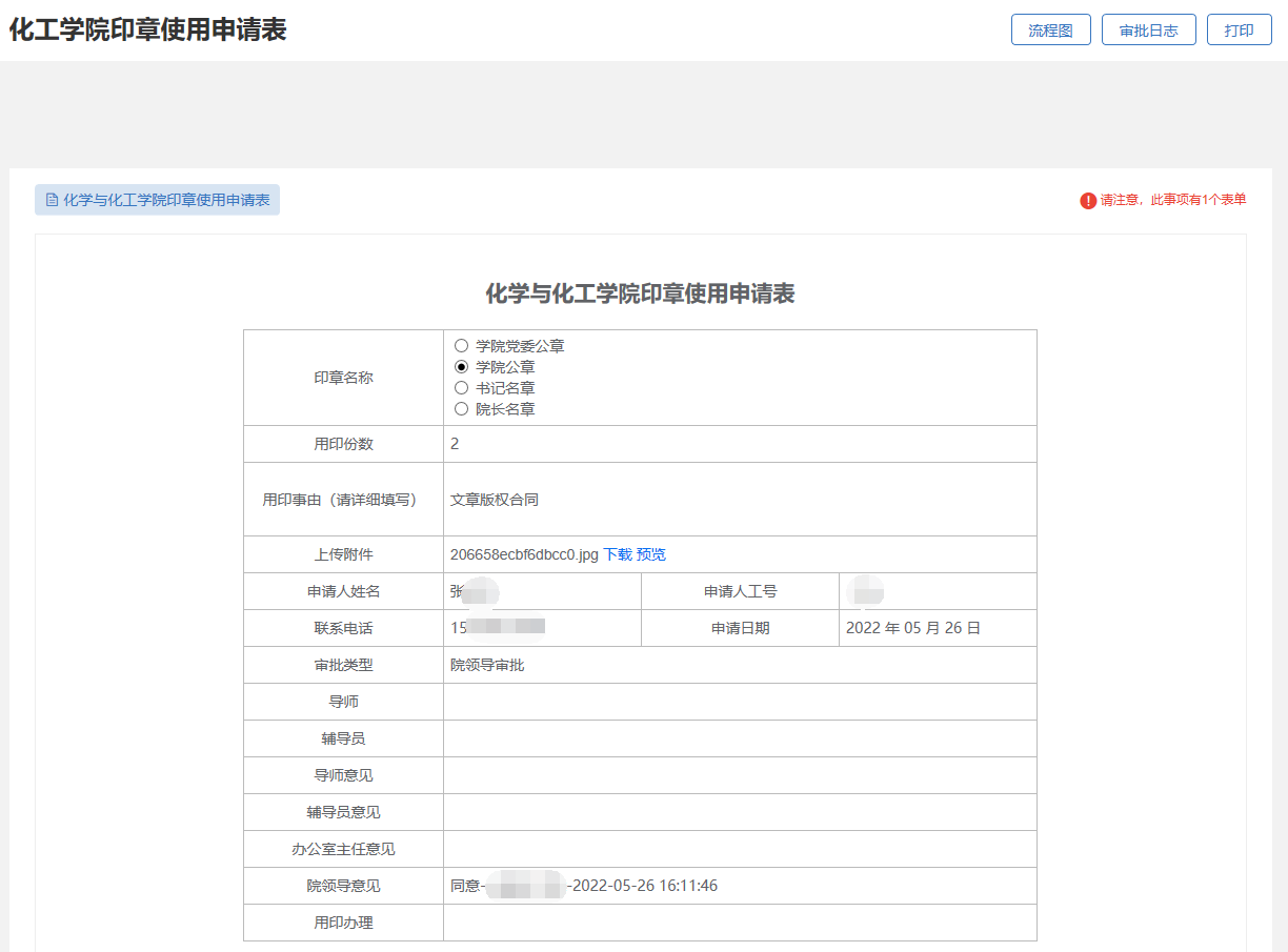 2021年4月,信息与网络管理中心按照化学与化工学院提出的网上用印流程建设需求,经过前期沟通、过程梳理、建设、测试等环节,于次月在“网上办事大厅”上线“化学与化工学院印章使用申请”,上线一年时间,申请用印数量达到558项,平均用时0.6天,最短用时1分钟,师生办事效率、学院管理效率均得到极大提升。