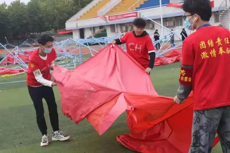 由于风大,吹翻了搭建好的帐篷,今年会学生志愿者主动请缨,顶着大风去中心体育场整理帐篷,捡拾垃圾,付出了辛勤的劳动。这些都让我们倍感温暖,让新生看到了材化学子的责任与担当,对大学生活充满了信心与期待。