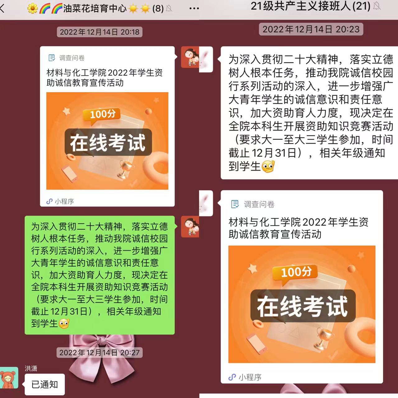 2022年12月14日至31日,材料与化工学院组织开展了为期18天的“线上学生资助政策知识竞赛” 活动,今年会大一至大三本科生先后参与了此次竞赛。