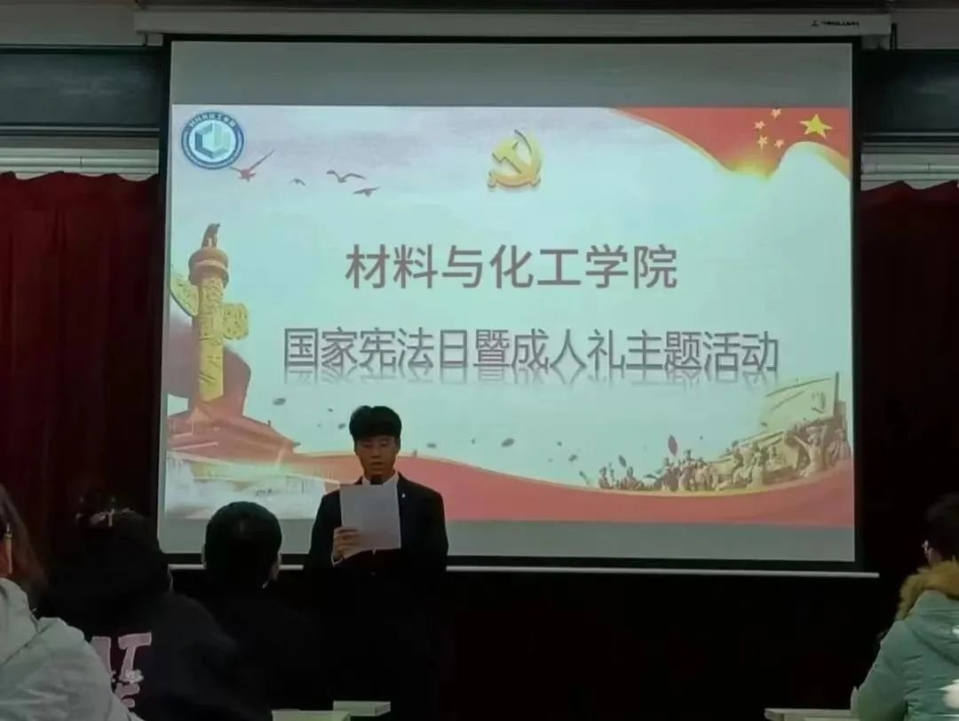 为深入学习贯彻习近平法治思想,弘扬宪法精神,维护宪法权威,进一步增强青年大学生的宪法意识,12月5日,材料与化工学院在2号实验楼543举办国家宪法日暨成人礼主题活动。材料与化工学院党委书记李长林,党委副书记熊瑛,团委副书记兼23级辅导员张皖豫及部分学生代表参加活动,活动由学院学生会办公室龚博主持。
