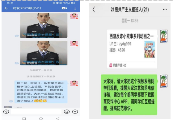 立足国家安全时代背景,提升学生金融安全意识。学院充分发挥班级微群方便快捷的优势,向学生推送趣味防诈骗安全教育视频。各年级通过“视频+文字”喜闻乐见的视频内容宣传,增强同学们防诈骗教育的接受度,提高其防诈骗意识。同时提醒学生及时下载安装国家反诈中心APP,杜绝电信诈骗事件发生。