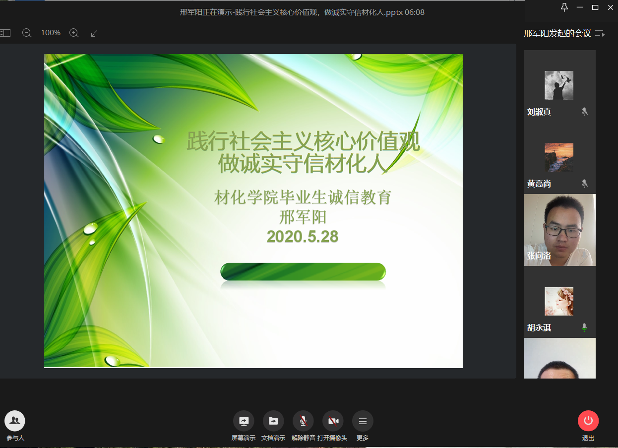 毕业季来临之际,为进一步提高材化学子的诚信意识,塑造材化学子健康向上的人生价值观,完成毕业生诚信教育工作。材料与化工学院学生工作办公室主任邢军阳于2020年5月28日,通过企业微信结合助学贷款内容给毕业生上了一堂诚信教育课。