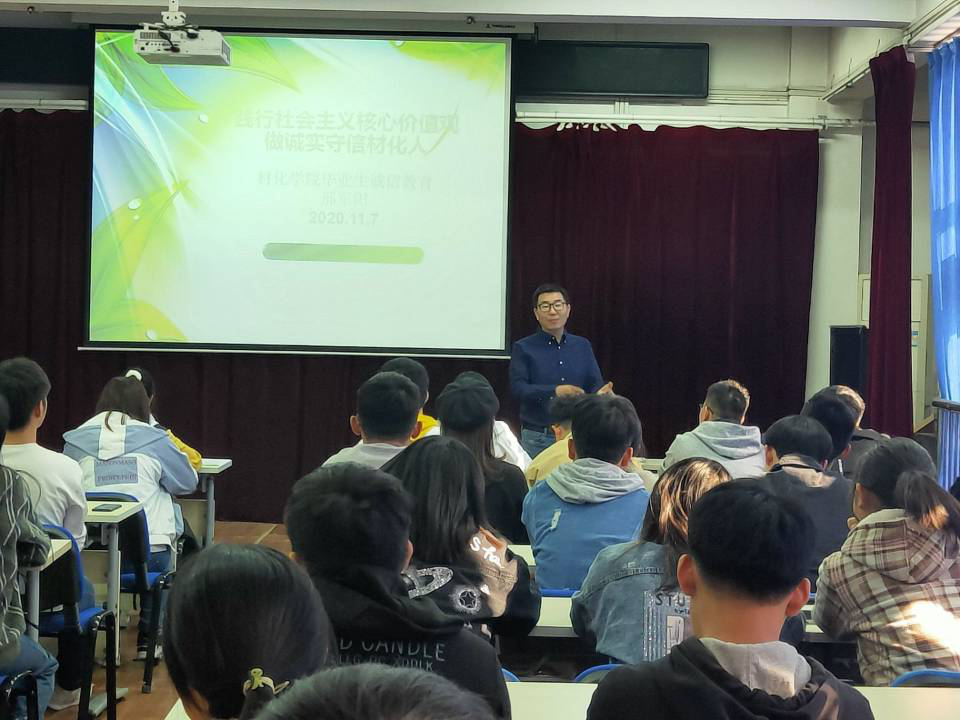 他讲到,我们当代青年大学生要践行社会主义核心价值观,做一名诚实守信的材化人。他通过举例子向同学们说明失信带来的不是少还款的快乐,而是给自己甚至是家人、朋友带来诸多的麻烦。表达出诚实守信在当今社会的重要性,失去诚信,将在当今社会无法立足。