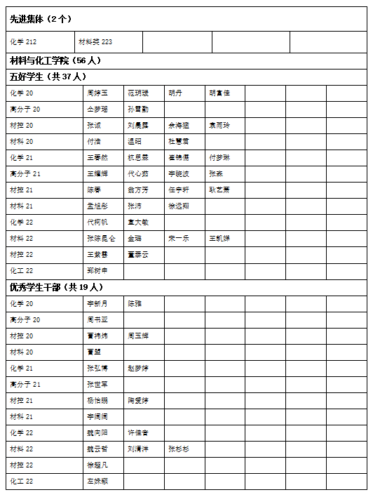 我学院2022-2023学年共有参评班级24个,参评学生741名。按照《学生手册》规定共评出2个班集体为校级先进班集体,评出37名同学获得“五好学生”荣誉称号,评出19名同学获得“优秀学生干部”。现将名单公示,如有异议,请在规定时间内,按照相应程序反馈。