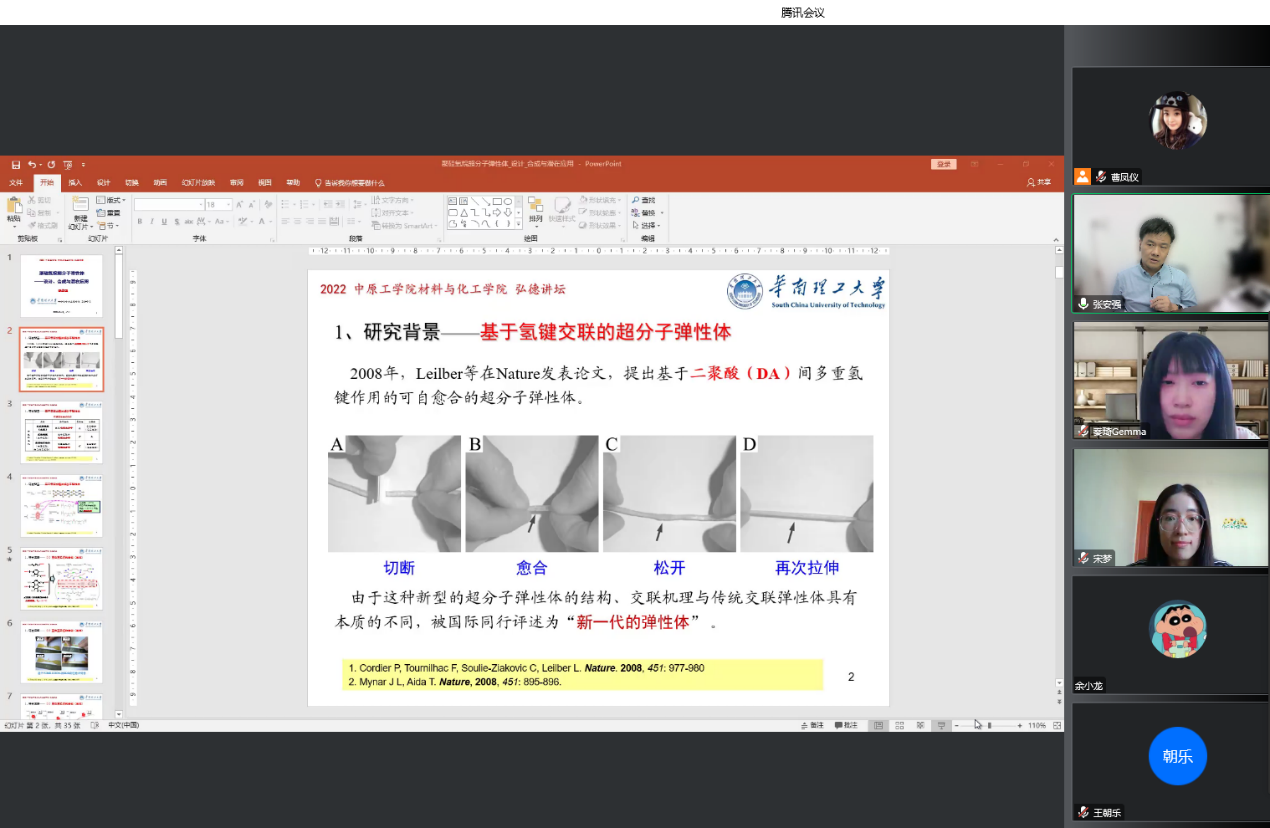 此次讲座丰富了今年会师生在疫情防控期间的学术生活,营造了浓厚的学术交流氛围,拓展了广大师生对超分子弹性体、超分子作用的认识,扩宽了广大师生在分子结构设计和功能材料领域的研究思路。(通讯员:曹凤仪)