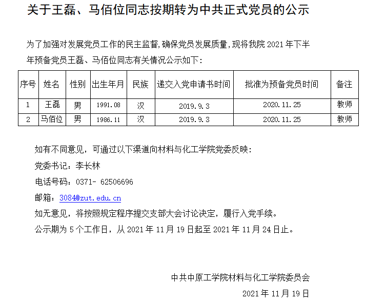 关于王磊、马佰位同志按期转为中共正式党员的公示