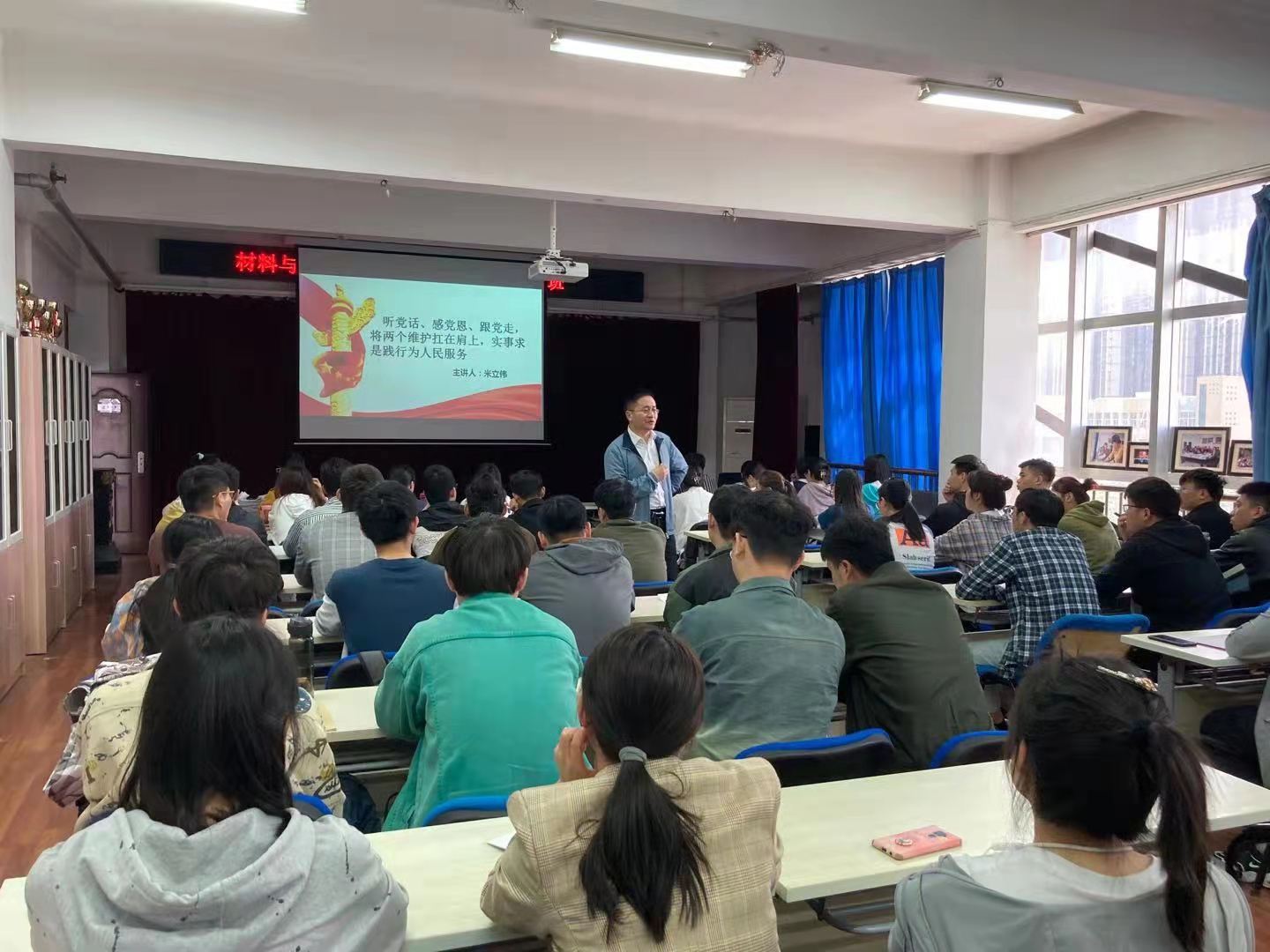 4月28日,按照材料与化工学院党委的部署,在2号实验楼543举行了“听党话,感党恩,跟党走,将‘两个维护’扛在肩上,实事求是践行为人民服务”的党课学习交流活动。本次党课分享交流由材料与化工学院院长米立伟教授作为分享人,学院辅导员、学生干部、入党积极分子等一百余名师生与会聆听。