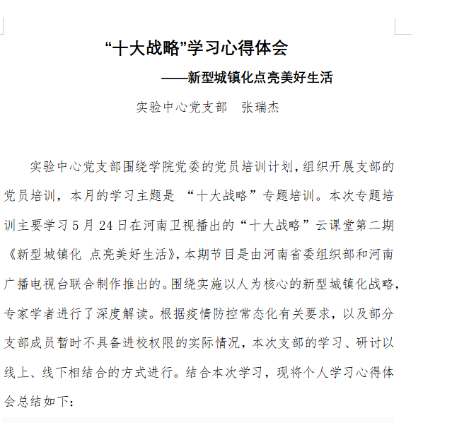 5月26日支部召开线上党员大会,为学院领导班子召开“720”以案促改民主生活,广泛征求党员、干部和群众意见建议,为院领导班子和领导干部找准问题、开好民主生活会做准备。关于学校增补两委委员候选人预备人选的文件,我支部征求、收集各位党员同志意见:本支部五位党员同志一致同意校党委的推荐人选。5月份的主题党日活动的学习主题是 “十大战略”专题培训。本次专题培训主要学习5月24日在河南卫视播出的“十大战略”云课堂第二期《新型城镇化 点亮美好生活》,本期节目是由河南省委组织部和河南广播电视台联合制作推出的。围绕实施以人为核心的新型城镇化战略,专家学者进行了深度解读。根据疫情防控常态化有关要求,以及部分支部成员暂时不具备进校权限的实际情况,本次支部的学习、研讨以线上、线下相结合的方式进行。支部党员分别在线上观看了视频学习材料, 5月30日召开支部座谈会,交流学习心得、实践体会,会后要求每位党员撰写个人学习心得体会。